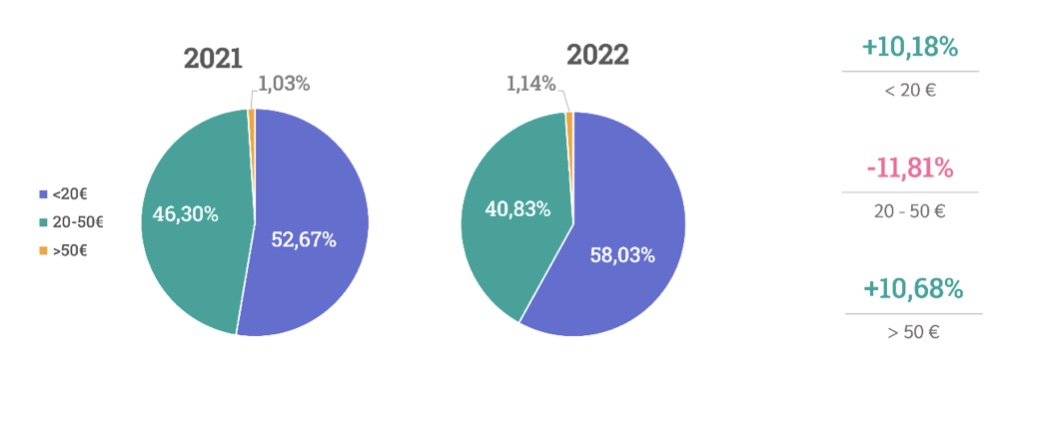 Los restaurantes más baratos (es decir, aquellos de menos de 20€ por comensal) y los más caros (aquellos de más de 50€ por cliente) son los que más han crecido en volumen de establecimientos, aumentando un 10,18% y un 10,65%, respectivamente. En cambio, los restaurantes de precio medio (los que su precio varía entre 20€ y 50€ por comensal) han perdido un 11,81% de cuota de mercado.