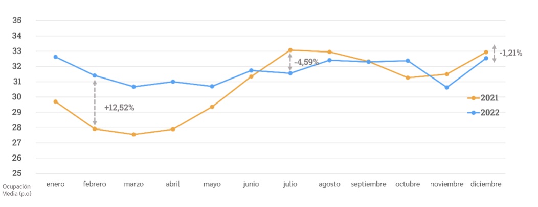 Otro interesante dato que nos deja este informe es que el 2022 ha sido un año caracterizado por un comportamiento más armónico sí de ocupación hablamos frente al 2021. Todo ello provocado por la ausencia de restricciones por el estado de alarma. El mes con más diferencial interanual fue el febrero, con un crecimiento de más 12% en 2022 respecto 2021.